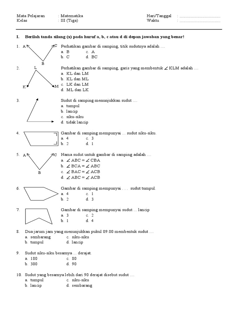 Setiap soal memiliki bobot nilai yang sama. Soal Sudut Kelas 3 SD. Dalam artikel ini berisi tentang materi kelas 4 SD bertemakan sudut.